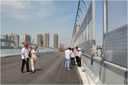 在后期施工配合中,項(xiàng)目設(shè)計(jì)組成員積極主動(dòng)為建設(shè)方與施工單位提供服務(wù),解決施工中遇到的技術(shù)難題,受到了建設(shè)方與施工單位的一致認(rèn)可。在昆明路西段即將建成之際,我公司一分院項(xiàng)目設(shè)計(jì)組成員主動(dòng)赴現(xiàn)場(chǎng)回訪,協(xié)助施工單位解決鋪裝、護(hù)欄安裝、聲屏障安裝過程中遇到的問題,為昆明路東段后續(xù)施工提供技術(shù)支持與服務(wù),同時(shí)也為我公司承攬此類項(xiàng)目積累寶貴經(jīng)驗(yàn)。
