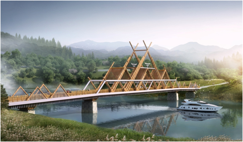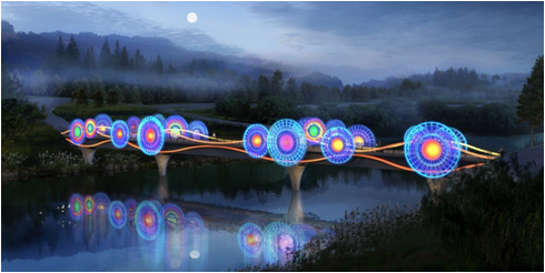 竹藝?yán)葮?/b>主體結(jié)構(gòu)為三跨連續(xù)鋼箱梁橋。本方案以廣西毛南族花竹帽為原型,利用圓形和發(fā)散形的骨架,建成或大或小的草帽狀構(gòu)筑物,點(diǎn)綴橋身,相映成趣。通過簡(jiǎn)單優(yōu)美的線條表現(xiàn)山水倒影,意象深遠(yuǎn)。