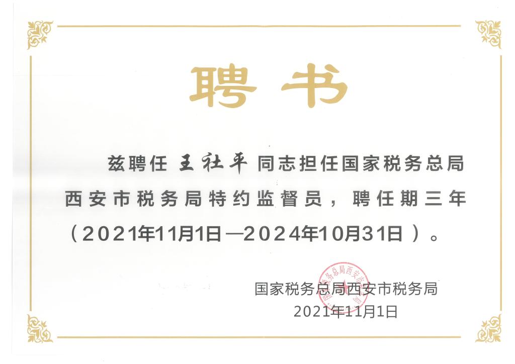 為進(jìn)一步深化作風(fēng)效能建設(shè)、提升管理服務(wù)水平、優(yōu)化稅收營商環(huán)境,充分發(fā)揮社會監(jiān)督的積極作用,西安市稅務(wù)局面向社會聘請來自各行各業(yè)的特約監(jiān)督員。11月3日上午,西安市稅務(wù)局紀(jì)檢組主任高紅軍一行蒞臨我公司,特為我公司副總經(jīng)理、西安市政協(xié)委員王社平同志頒發(fā)國家稅務(wù)總局西安市稅務(wù)局特約監(jiān)督員聘書。