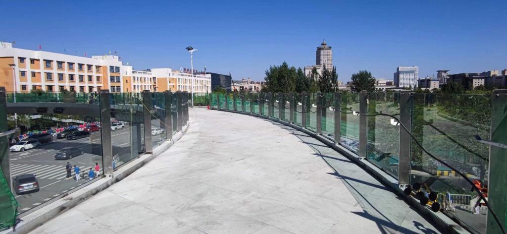 榆林高新區(qū)建業(yè)大道-長興路過街人行天橋(高新一中人行天橋)位于榆林市建業(yè)大道與長興路交叉口,主橋采用直徑83m的環(huán)形變截面鋼箱梁結(jié)構(gòu),主橋全長為245.05m,梁高1.2-1.8m,主橋?qū)?m,橋梁總面積2047㎡。天橋所有方向均采用一跨跨越現(xiàn)狀道路,主跨55.985m,在同類人行天橋中跨徑較大。通透的玻璃欄桿搭配曲線明快的主梁,猶如一條流動的綢帶,簡潔現(xiàn)代,婉約流暢。該天橋為榆林高新一中設(shè)置了專用梯道接入校內(nèi)方便師生使用,同時增加了電渦流調(diào)諧質(zhì)量阻尼器提升行人通行的舒適性。