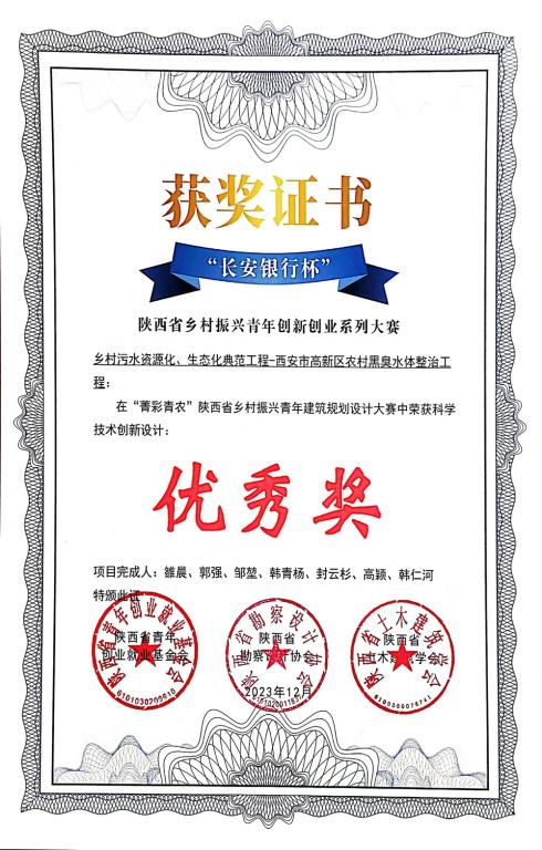 12月17日,由團(tuán)省委、省科技廳、省住建廳等多家單位聯(lián)合舉辦的“長安銀行杯”陜西省鄉(xiāng)村振興青年創(chuàng)新創(chuàng)業(yè)系列大賽頒獎儀式在中國建筑西北設(shè)計(jì)研究院有限公司舉辦,我公司參賽作品《鄉(xiāng)村污水資源化、生態(tài)化典范工程—西安市高新區(qū)農(nóng)村黑臭水體整治工程》榮獲“科學(xué)技術(shù)創(chuàng)新設(shè)計(jì)優(yōu)秀獎”。