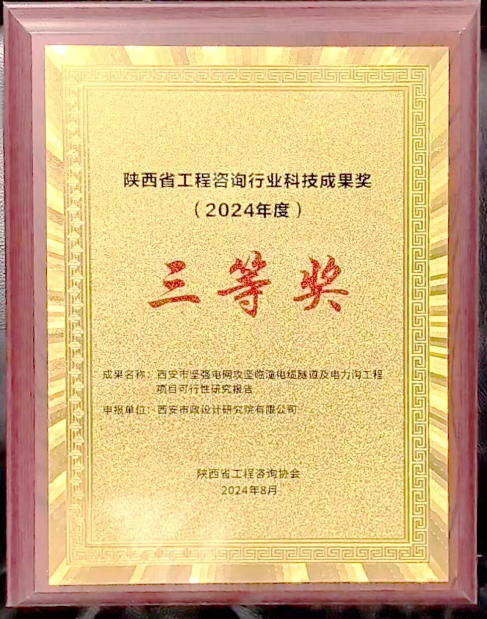 近日,陜西省工程咨詢協(xié)會(huì)頒發(fā)了2024年度陜西省工程咨詢行業(yè)科技成果獎(jiǎng)獎(jiǎng)牌和證書(shū),我公司編制的《西安市堅(jiān)強(qiáng)電網(wǎng)攻堅(jiān)臨潼電纜隧道及電力溝工程項(xiàng)目可行性研究報(bào)告》、《渭南市低碳智慧清潔能源綜合利用示范項(xiàng)目可行性研究報(bào)告》獲三等獎(jiǎng),《商洛市高鐵康養(yǎng)新城一期建設(shè)項(xiàng)目高鐵一路、高鐵十三路工程可行性研究報(bào)告》獲優(yōu)秀獎(jiǎng)。