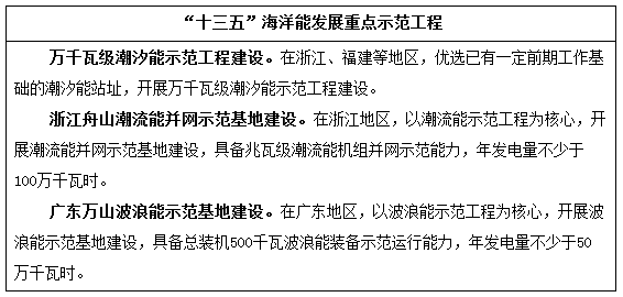 規(guī)劃提出主要目標(biāo),到2020年,海洋能開發(fā)利用水平顯著提升,科技創(chuàng)新能力大幅提高,核心技術(shù)裝備實現(xiàn)穩(wěn)定發(fā)電,形成一批高效、穩(wěn)定、可靠的技術(shù)裝備產(chǎn)品,工程化應(yīng)用初具規(guī)模,一批骨干企業(yè)逐步壯大,產(chǎn)業(yè)鏈條基本形成,標(biāo)準(zhǔn)體系初步建立,適時建設(shè)國家海洋能試驗場,建設(shè)兆瓦級潮流能并網(wǎng)示范基地及500千瓦級波浪能示范基地,啟動萬千瓦級潮汐能示范工程建設(shè),全國海洋能總裝機(jī)規(guī)模超過50,000千瓦,建設(shè)5個以上海島海洋能與風(fēng)能、太陽能等可再生能源多能互補(bǔ)獨(dú)立電力系統(tǒng),拓展海洋能應(yīng)用領(lǐng)域,擴(kuò)大各類海洋能裝置生產(chǎn)規(guī)模,海洋能開發(fā)利用水平步入國際先進(jìn)行列。